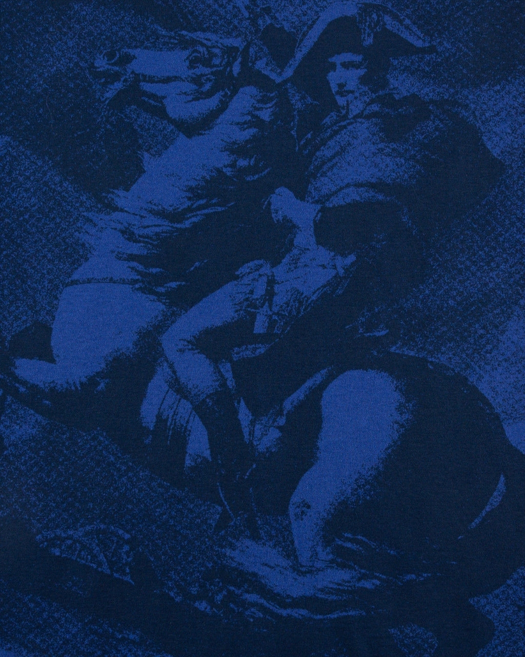 A tribute to French legacy — this piece reimagines the nation’s most iconic painting, Napoleon Crossing the Alps, woven into deep navy cotton. Tricolour stripes descend from the shoulders, while the chest is embroidered with the French football crest.